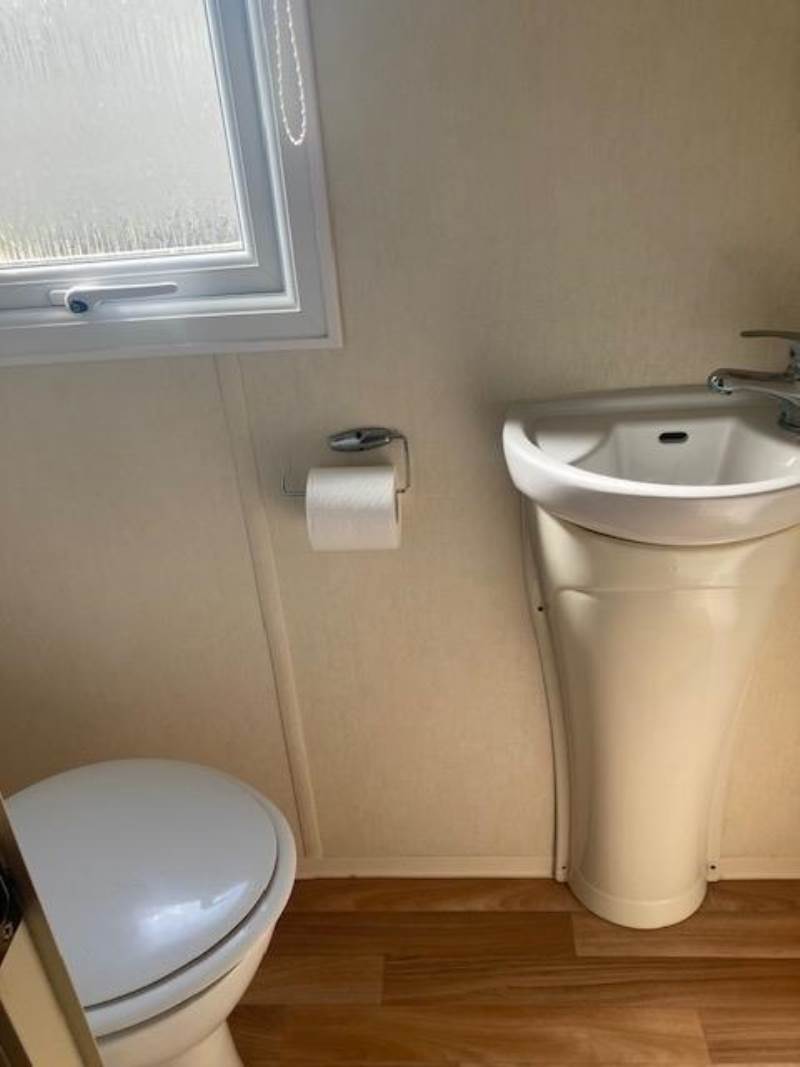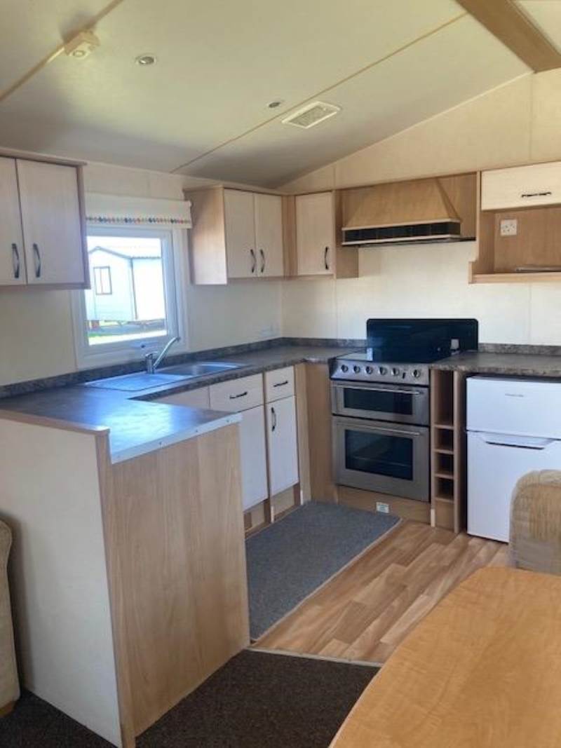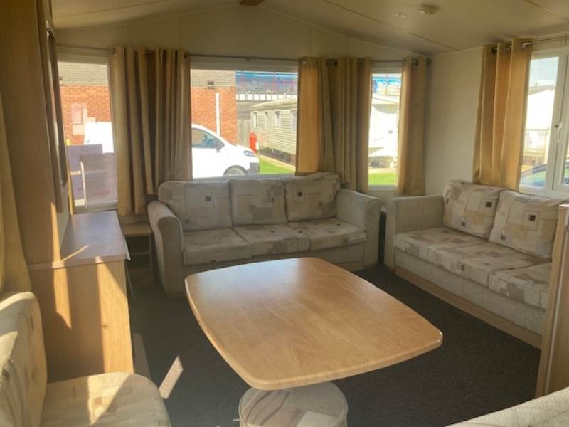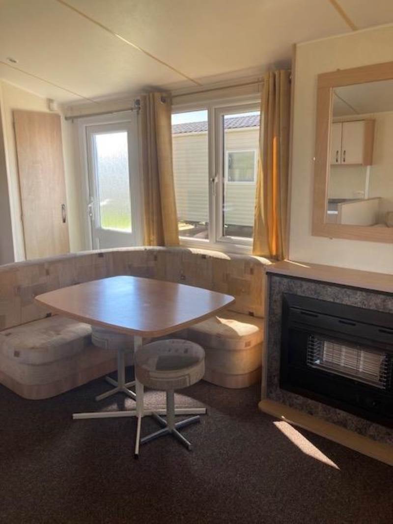 The lounge has two sofas and a dining table with wrap around seating and two additional stools.